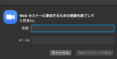 「当日の視聴はこちらから」ボタンを押すと、名前とメールアドレスを入力する画面が表示されます。